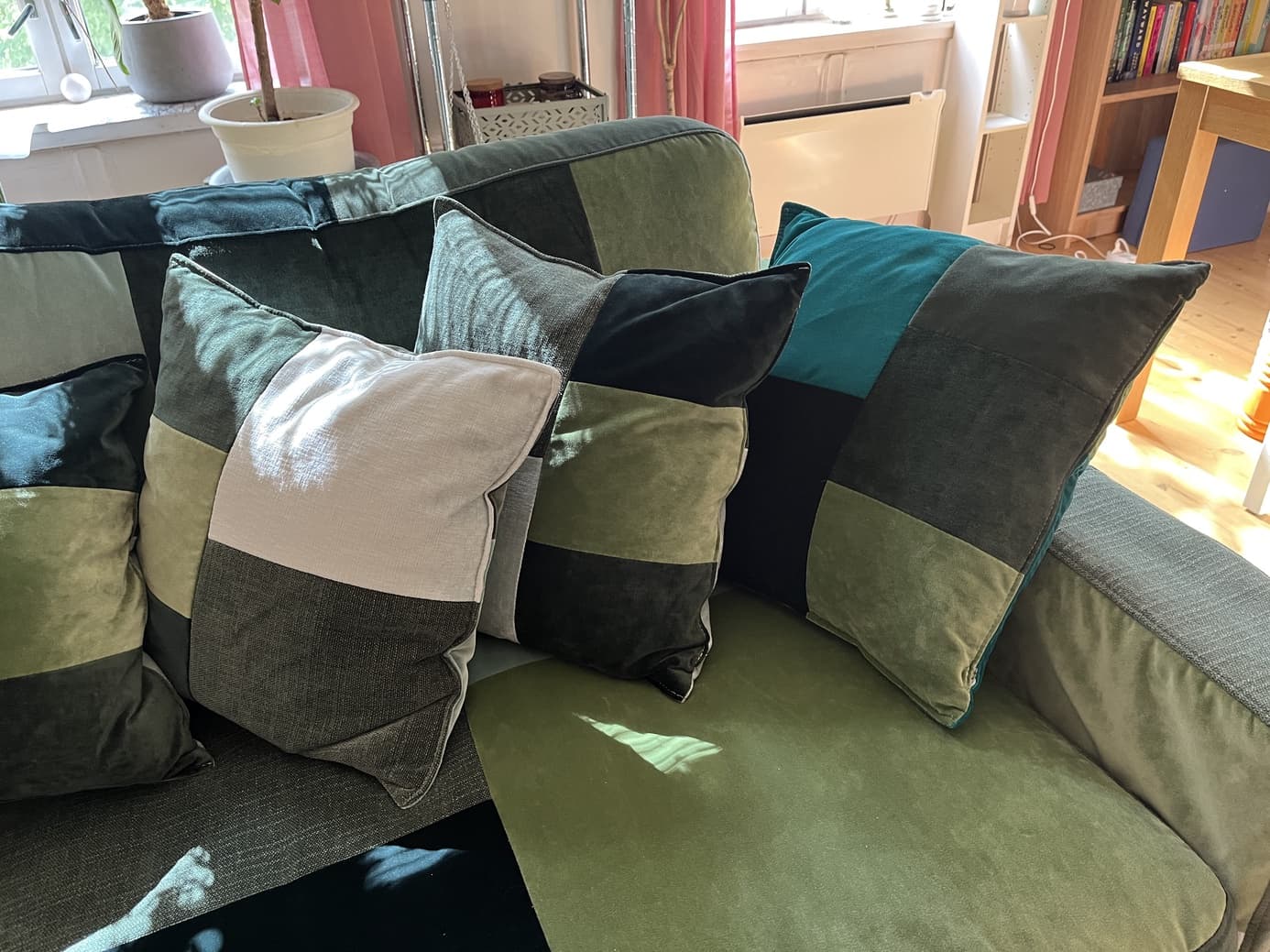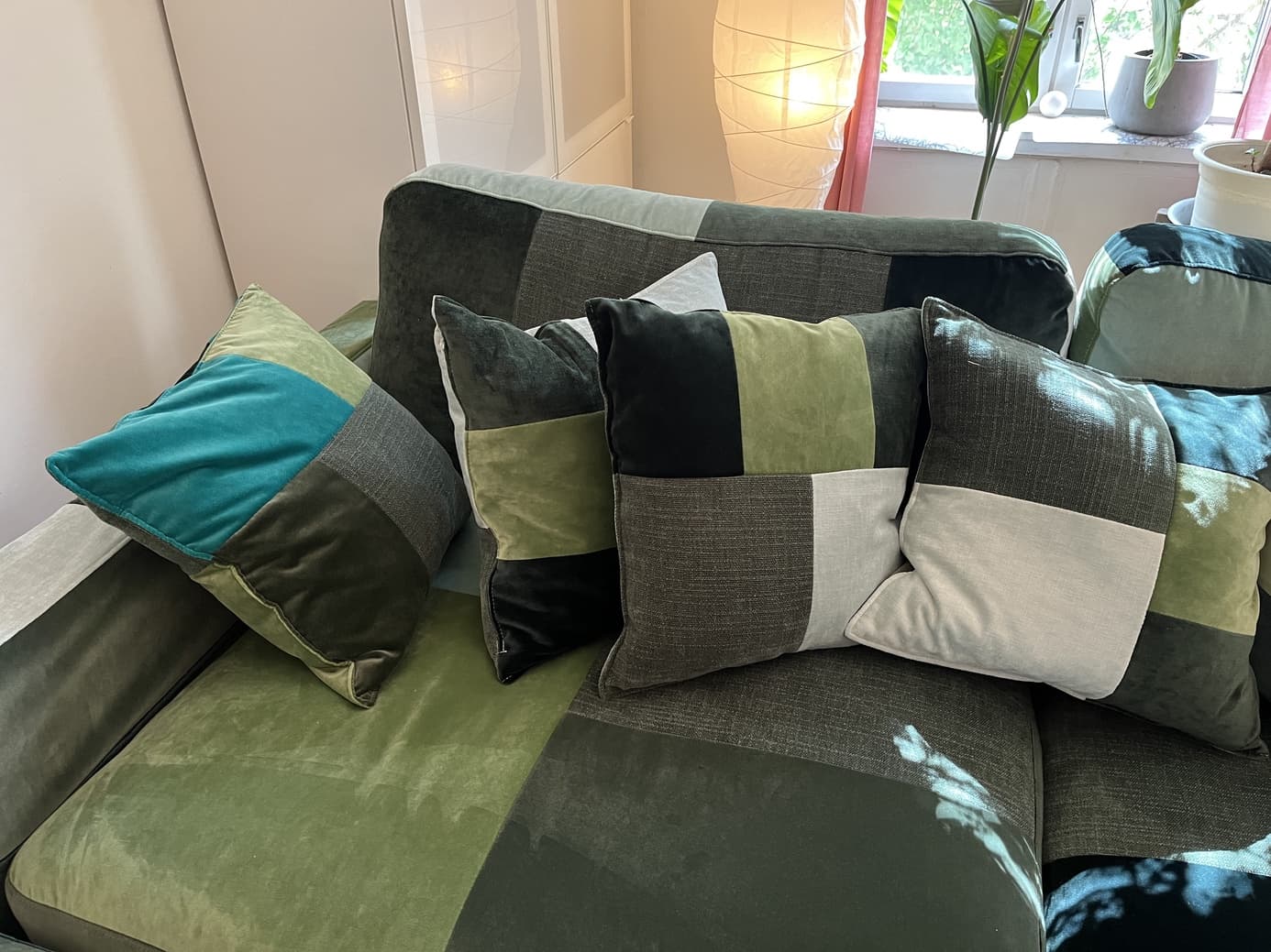 Ich habe 2 zusätzliche Kissen für ein Patchwork-Sofa in Grüntönen bestellt, aber die Kissen haben eine andere Farbe als das Sofa und der Pouf, obwohl sie gleichzeitig bestellt wurden. Etwas enttäuschend, dass sie nicht zusammenpassen.