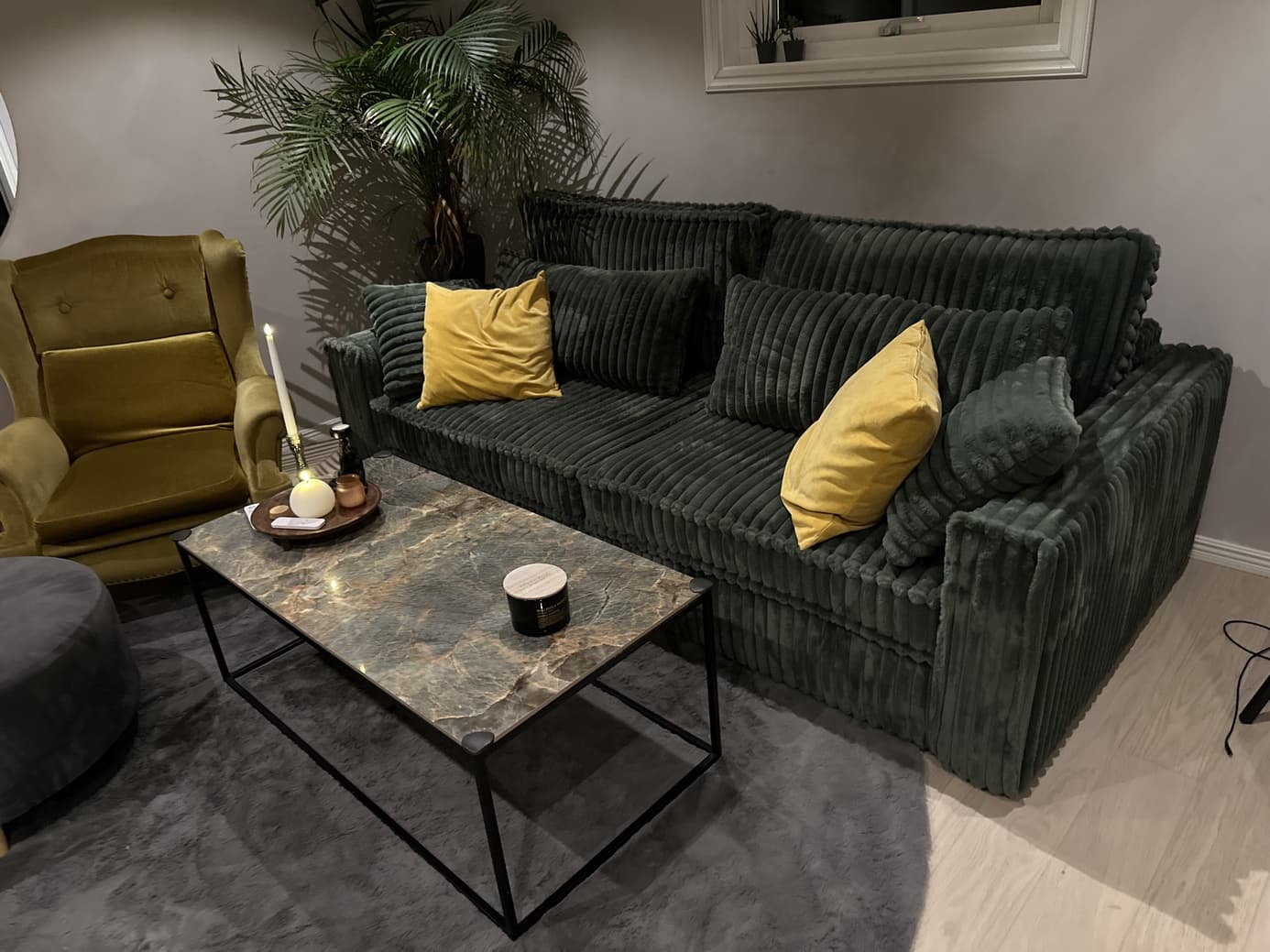 Schickes Sofa. Schicker Stoff (grüner Cord). Sehr schwer und leider auch sehr hart, als ich dachte! Ich hätte mir zwei kleine Kissen statt einem gewünscht, damit man beide Sofas gleichzeitig für einen Filmabend nutzen kann. Ich glaube, es wird im Sitzbereich sehr kurz, wenn man beide Kissen beim Sitzen drin lässt. Ansonsten ein fantastisches Sofa.
