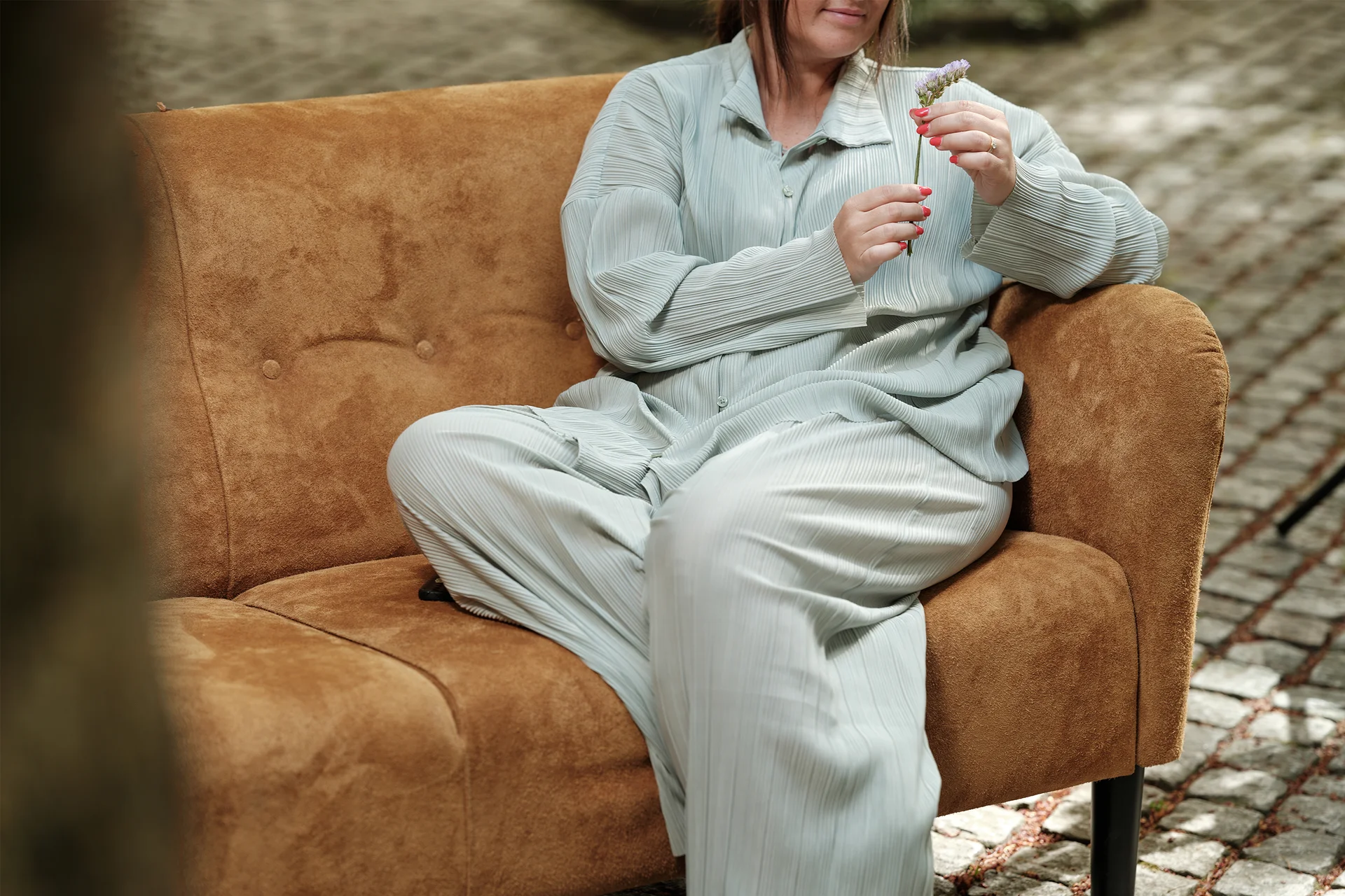 - Ein kleines Sofa und Sessel, mit daunenfreier Füllung aus Kaltschaum für bequemen, festen Sitzkomfort.