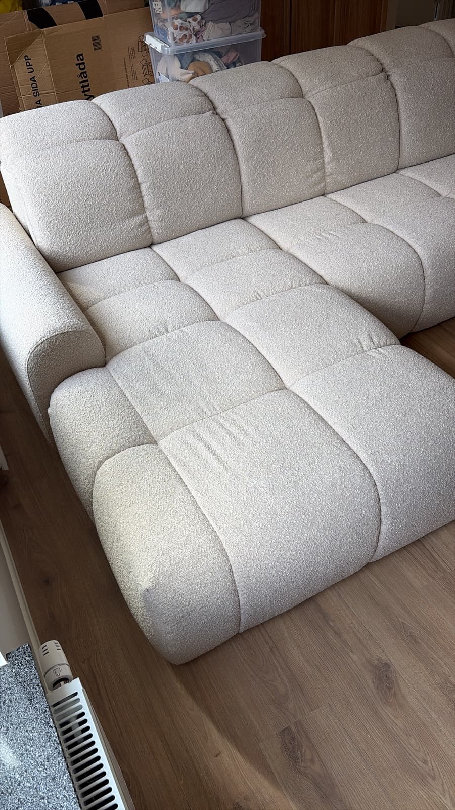 Ich hatte Panik, dass wir das Sofa nicht ins Obergeschoss bekommen würden. Ich habe mehrmals mit dem Kundenservice telefoniert und Majken hat mir super geholfen! Zum Glück ließ sich eine der Armlehnen leicht abnehmen, und mit etwas Kraftaufwand war es dann doch noch möglich. Laut Beschreibung sollte das Paket 90 cm groß sein, aber es ist nur etwa 84 cm lang – eine gute Nachricht! Ich war während der Lieferzeit mehrmals kurz davor, die Bestellung zu stornieren 🙈 Wir sind so glücklich! Wie viele andere auch schreiben, ist es ziemlich hart, aber ich hoffe, es wird mit der Zeit weicher. Ein wirklich tolles Möbelstück, das den ganzen Raum aufwertet. Wir freuen uns riesig über unser Valross 😍