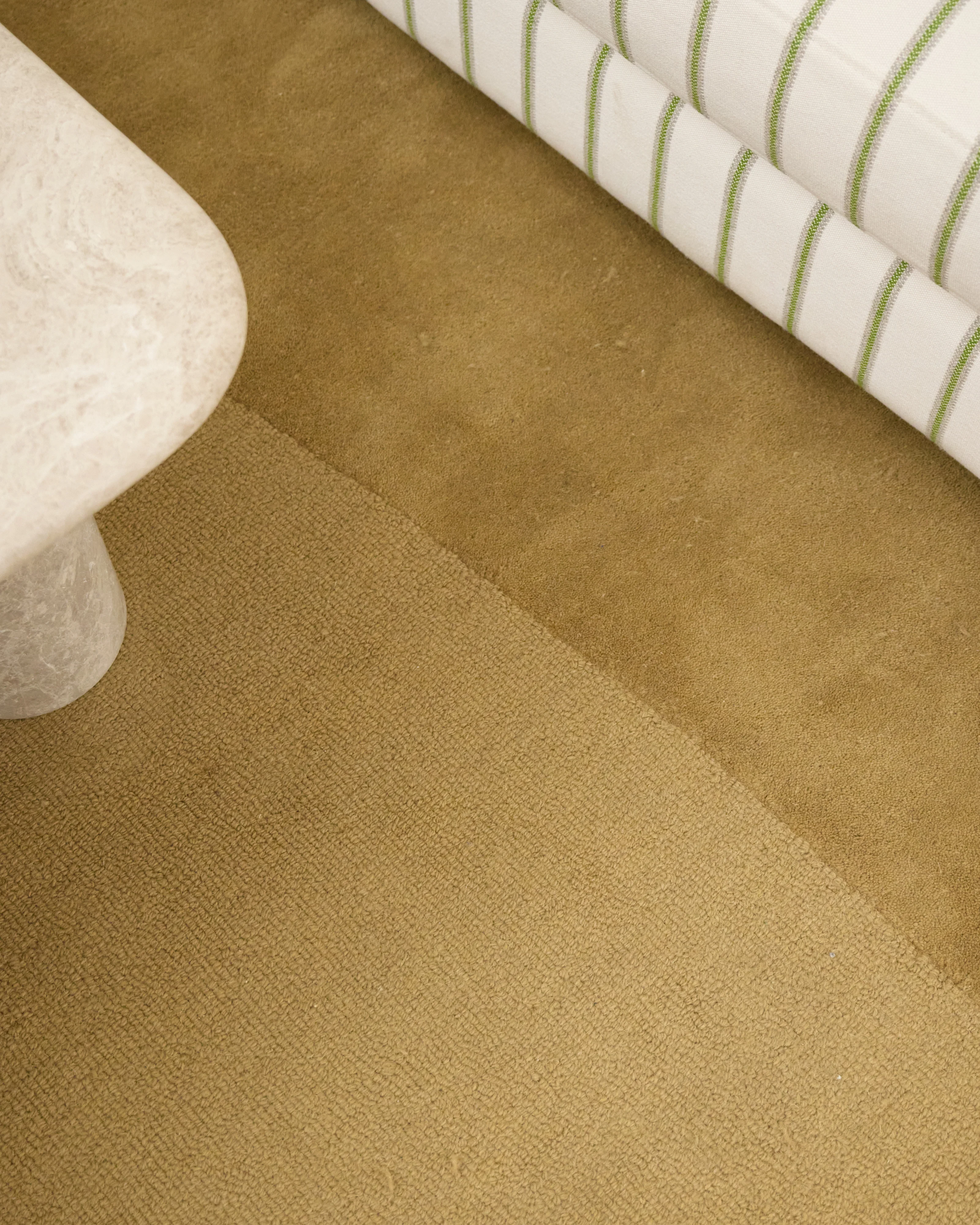Abwechselnde Felder aus geschnittenem Flor und Bouclé erzeugen ein elegantes, geschwungenes Muster.